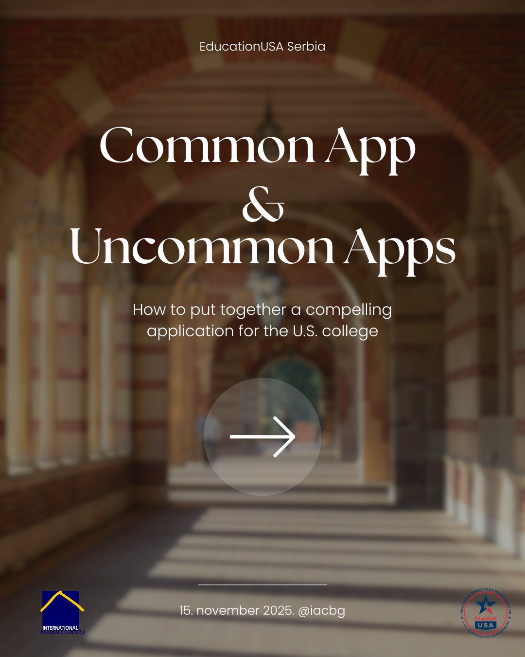 Online savetovanje o Common Application, opštoj prijavi za studiranje u SAD, namenjeno je srednjoškolcima koji planiraju upis osnovnih studija u Americi i koji žele da se uspešno predstave koledžima i univerzitetima sa kvalitetnom prijavom. Na savetovanju razgovaramo o opštoj prijavi i drugim prijavama koje se mogu pojaviti tokom procesa izbora koledža u Americi.