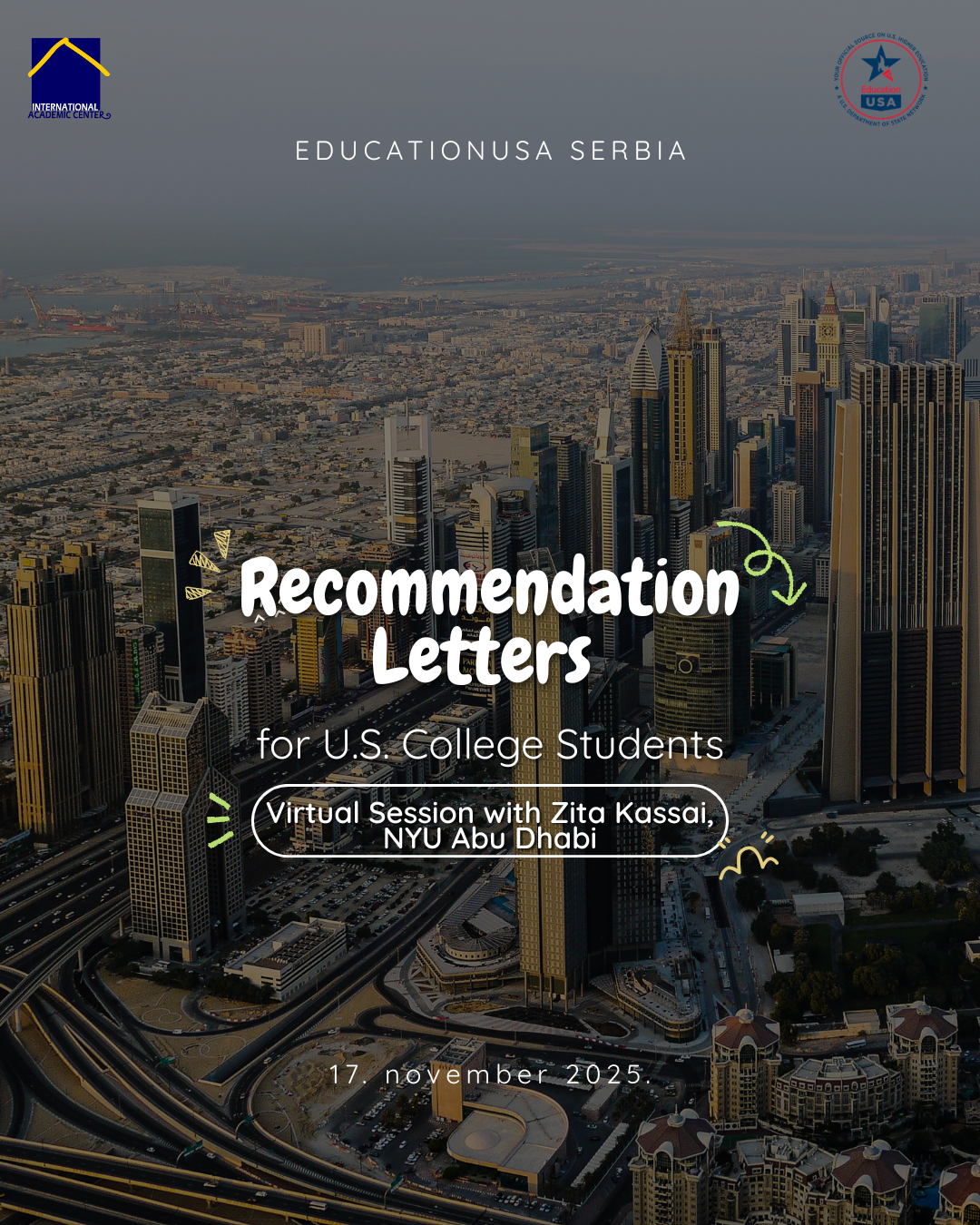 Zita Kassai, stručnjak za regrutovanje studenata i predstavnica za prijem međunarodnih studenata sa NYU Abu Dhabi univerziteta će sa zainteresovanima podeliti savete sa univerzitetske strane prijema studenata i objasniti šta je to što primaoci pisama preporuke očekuju od tih dokumenata. Na virtualnom sastanku biće više reči o sledećem: